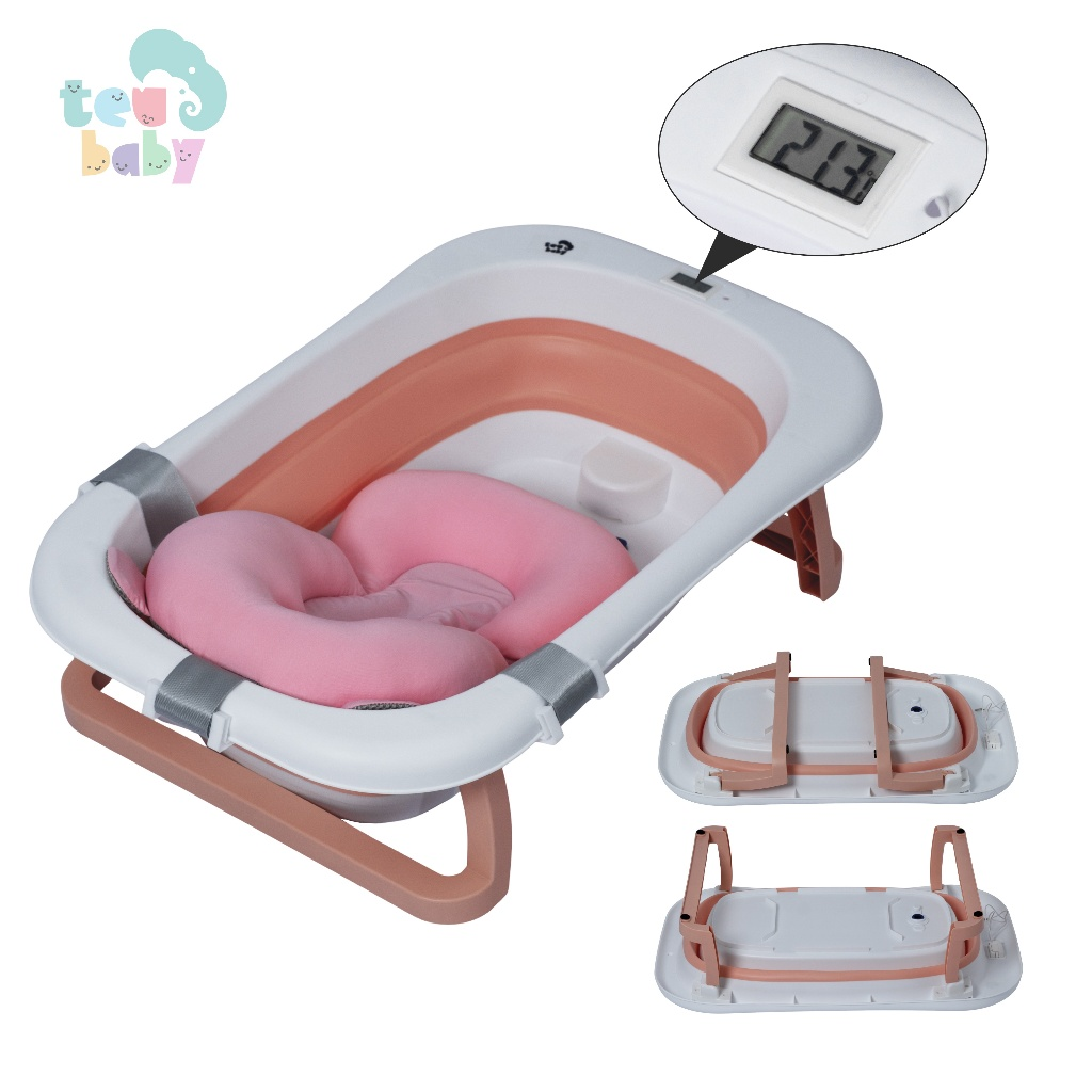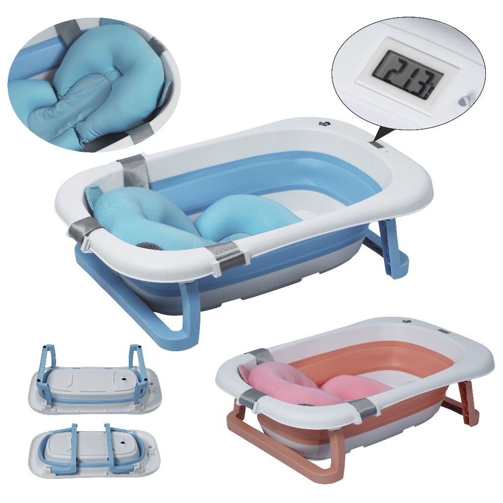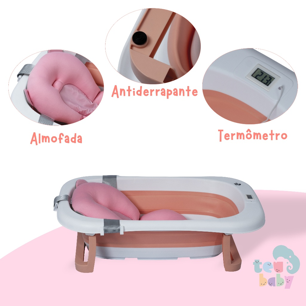 Banho seguro, confortável e sem bagunça para o seu bebê, Banheira dobrável com termômetro e almofada inclusa para transformar o banho em um momento tranquilo e especial.