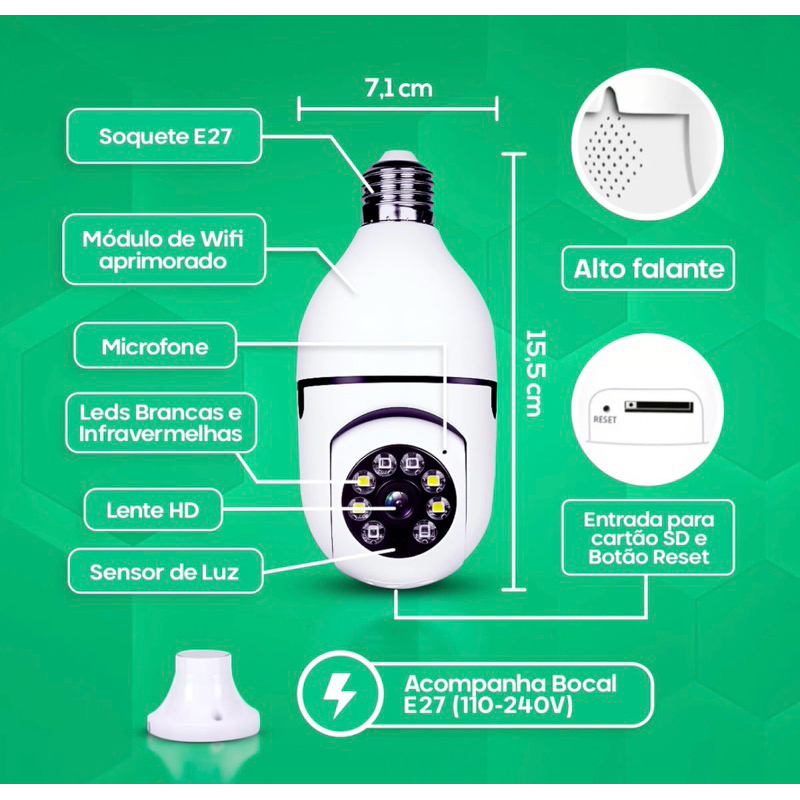 A Câmera de Segurança Wi-Fi IP Encaixe Lâmpada – La Mamma Connect oferece monitoramento completo com instalação simples: basta rosquear no bocal de lâmpada. Com rotação 360°, visão noturna colorida e áudio bidirecional, você acompanha tudo em tempo real pelo celular, de qualquer lugar.