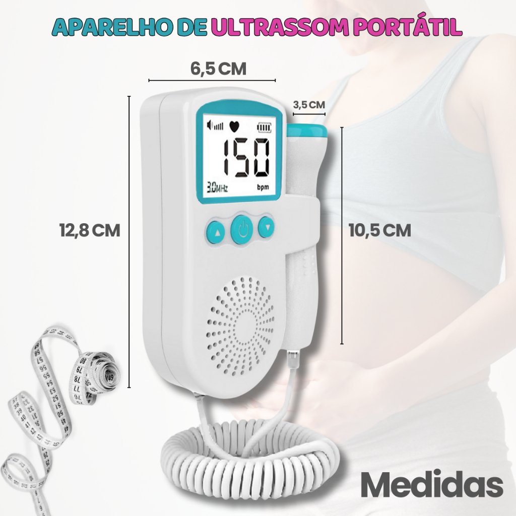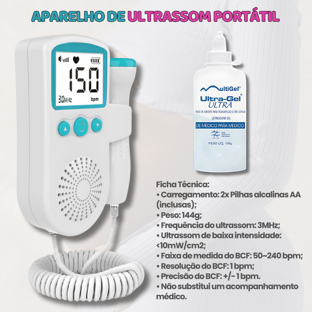 Com a aplicação do gel condutor, o aparelho capta os batimentos cardíacos do bebê por meio de tecnologia ultrassônica, exibindo a frequência no visor digital e reproduzindo o som em tempo real.