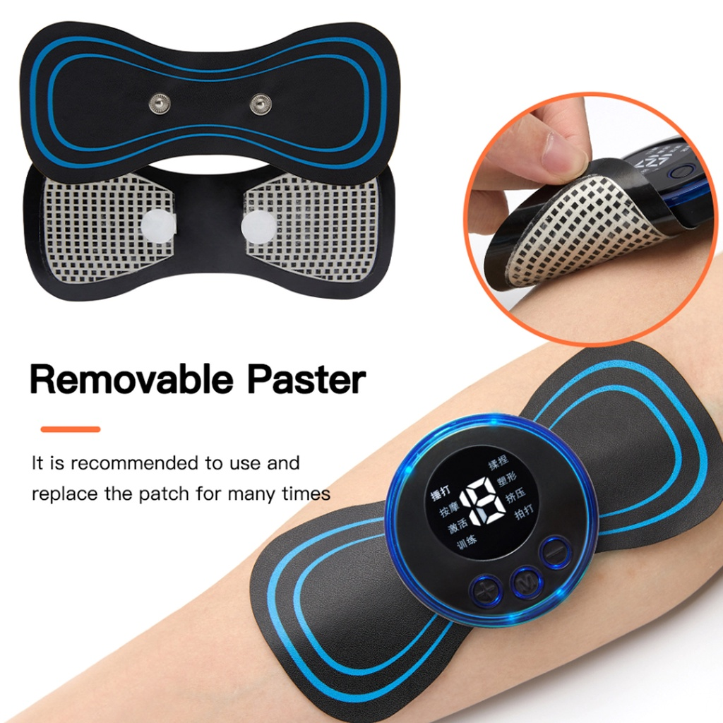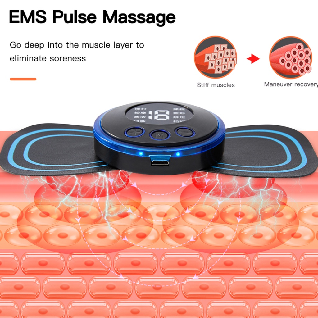 O mini massageador EMS utiliza pulsos de eletroestimulação para estimular a musculatura, promovendo relaxamento, conforto e sensação de bem-estar, de forma simples e prática.